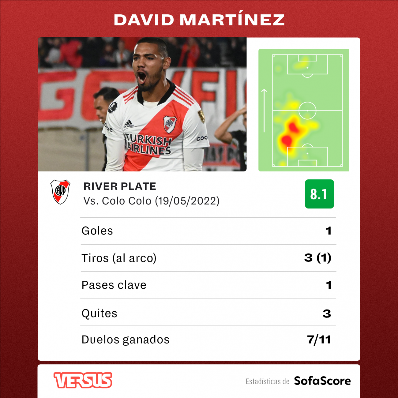 En el minuto 65, el zaguero aprovechó la peinada de su compañero Emanuel Mammana, cerró en el segundo palo y definió a placer para el tercer grito sagrado de la noche en el Monumental. Además registró 3 quites y ganó 7 de los 11 duelos que protagonizó.