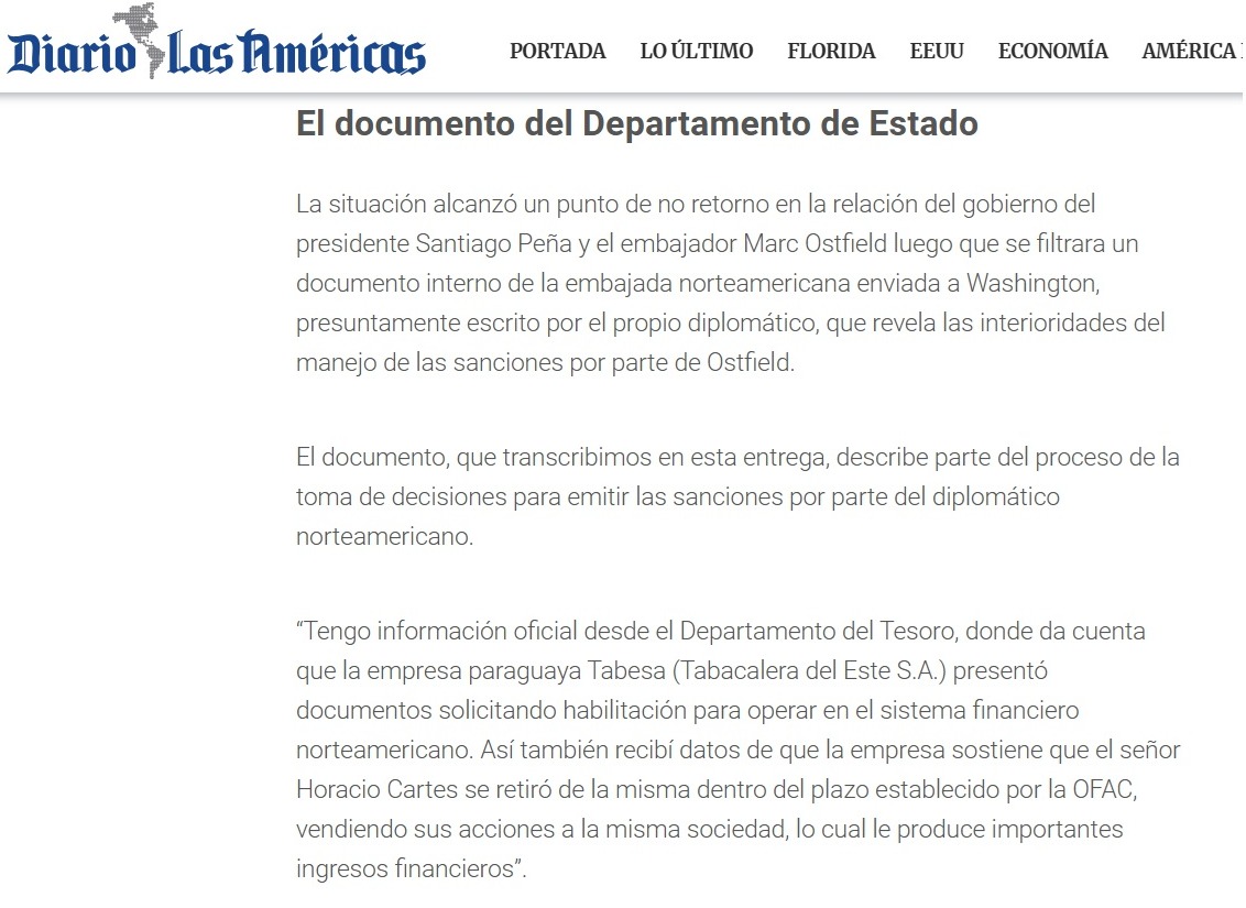 Como en Israel, donde se desmintieron los relatos sobre supuestos vínculos de Horacio Cartes con el terrorismo islámico, al ser invitado oficialmente a visitar el país, la filtración de “Las Américas” -de la que también se hicieron eco medios importantes como Clarín- confirma las denuncias previas de una campaña sistemática contra Cartes, respaldada ahora por estos documentos oficiales del Departamento de Estado.