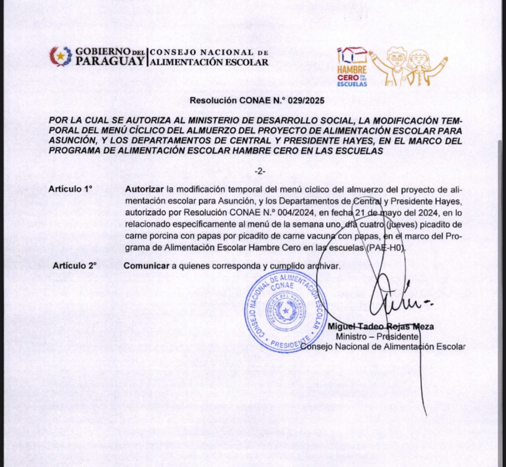 El ministro de Desarrollo Social, Tadeo Rojas, informó de la determinación del Consejo Nacional de Alimentación Escolar (Conae) de autorizar la modificación temporal del menú cíclico del almuerzo del proyecto de alimentación escolar Hambre Cero, específicamente al menú picadito de carne porcina con papas.