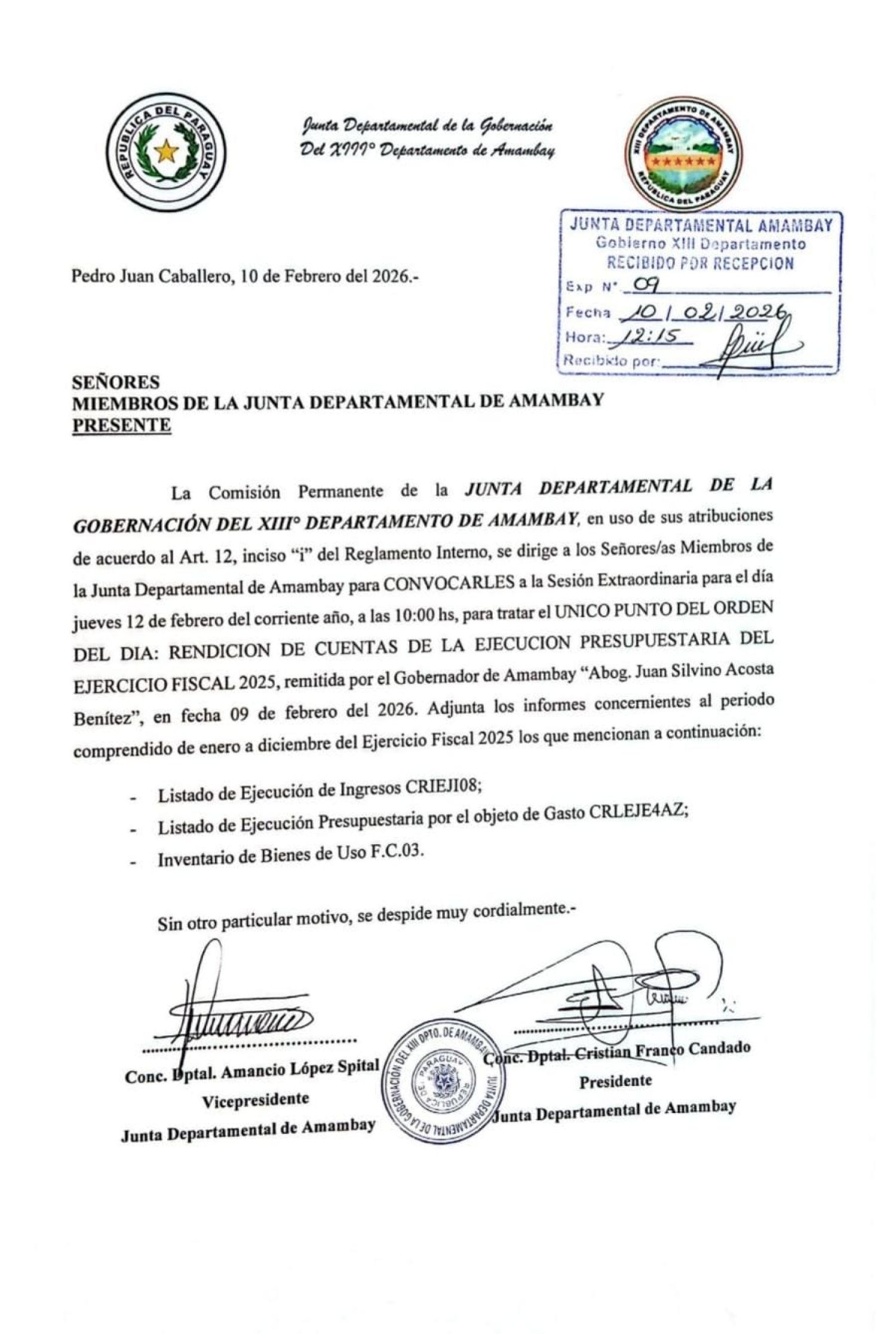 La Comisión Permanente de la Junta Departamental de Amambay, en uso de sus atribuciones reglamentarias, convocó a sus miembros para analizar la ejecución presupuestaria del Ejercicio Fiscal 2025, este jueves (12), a las 10:00 horas. El documento a ser examinado fue remitido por el gobernador de Amambay, Juan Silvino Acosta Benítez, el pasado 9 de febrero.
