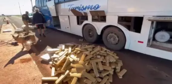 La PRF (Policía Rodoviaria Federa)l de Mato Grosso do Sul encontró varios ladrillos de marihuana dentro de la carrocería de un ómnibus de turismo que transportaba a 24 paraguayos a Florianópolis, e...