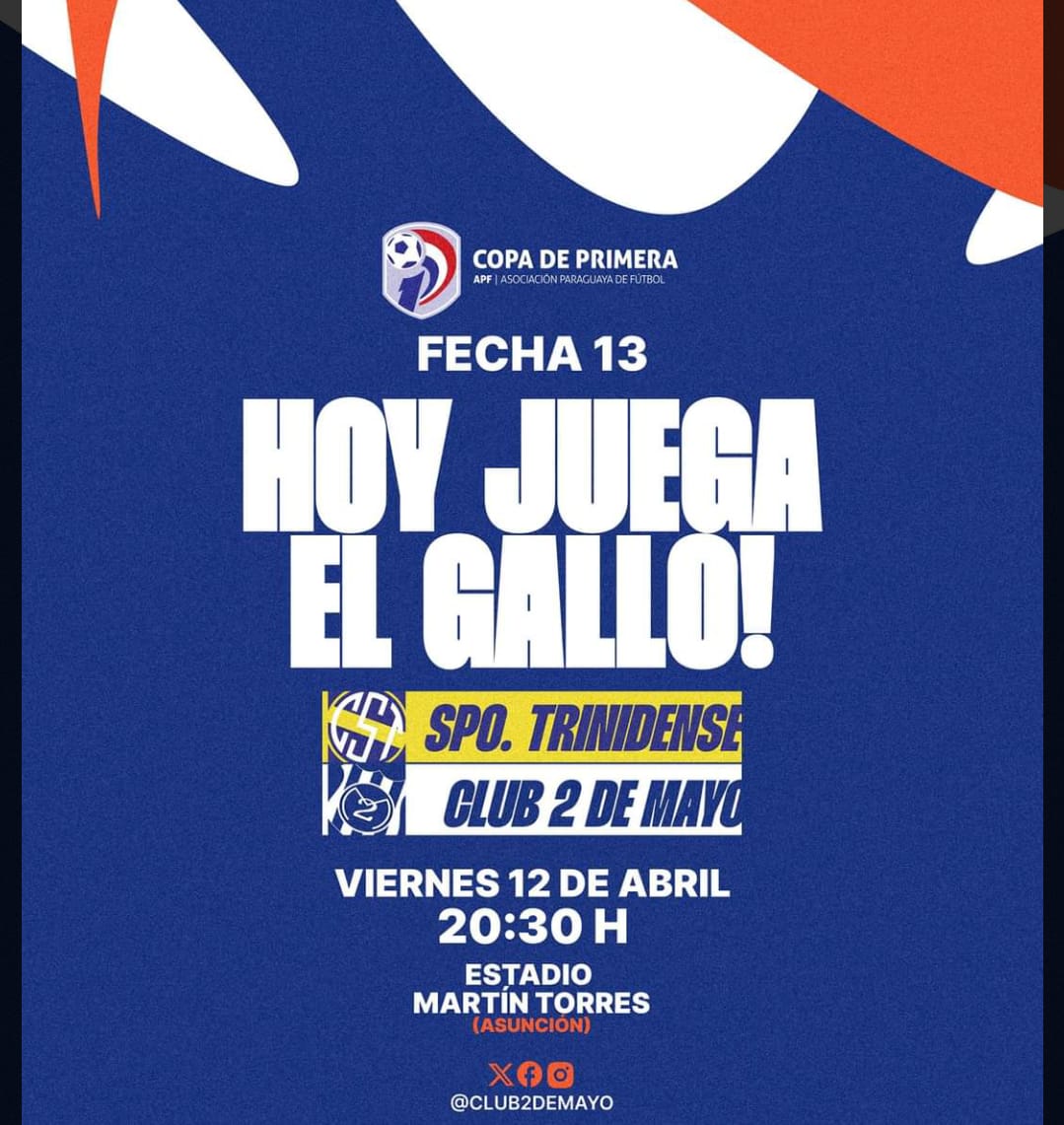 En la continuidad de la décimo tercera jornada, Sportivo Trinidense recibe en su estadio al Sportivo 2 de Mayo en juego a disputarse en el estadio Martín Torres de Santísima Trinidad, con transmisi...
