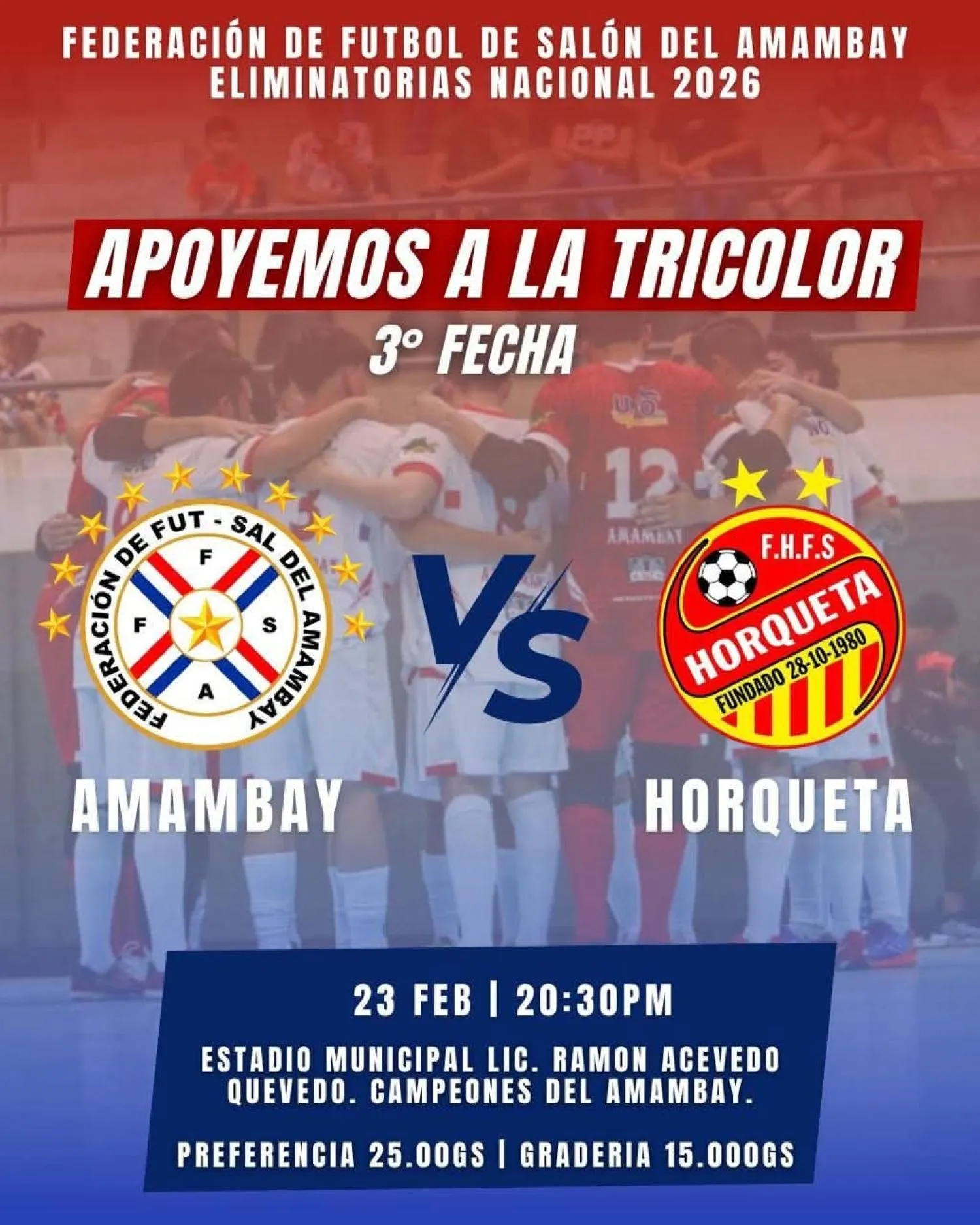 Amambay recibe este lunes (23) a las 20:30 horas a Horqueta por la tercera fecha del Grupo 7 de las eliminatorias para el Campeonato Nacional de Salón 2026. El duelo en el Estadio Municipal de Pedr...