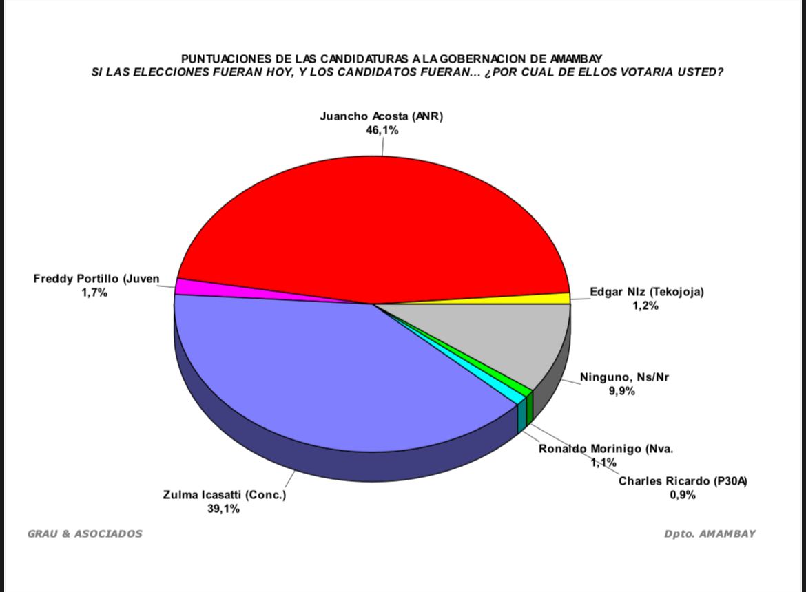 De acuerdo a las mediciones elaboradas por la encuestadora Grau & Asociados, el candidato de la Lista 1 Juancho Acosta (ANR) guarda una ventaja de 7 % aproximadamente en el departamento de Amambay.
