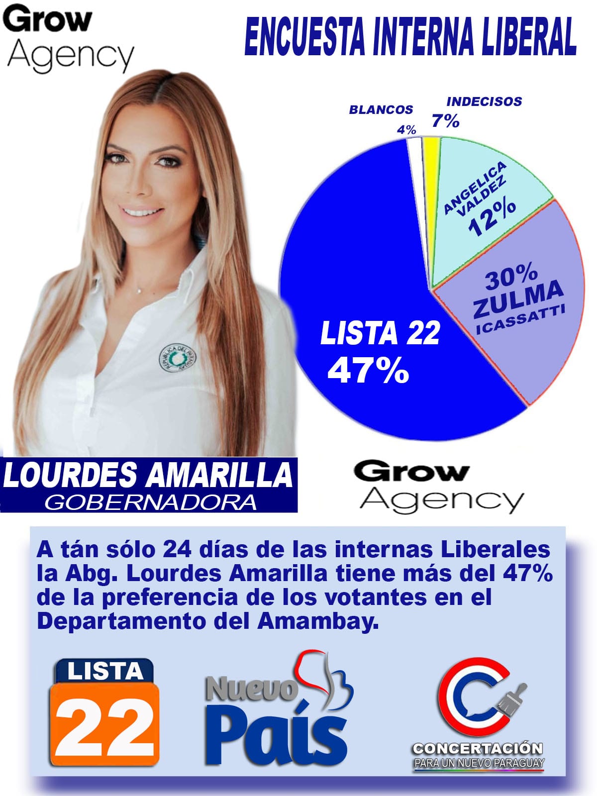 Una encuesta realizada en Amambay por Graw Agency reveló que la actual Concejal Municipal y pre candidata a la Gobernación de Amambay Lourdes Amarilla encabeza la preferencia de votos para la Gober...