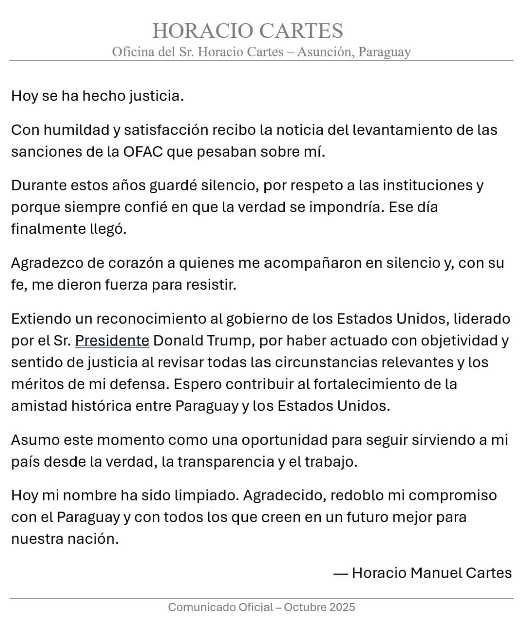 Cartes, actual presidente del Partido Colorado, agradeció al gobierno de Donald Trump “por haber actuado con objetividad y sentido de justicia al revisar todas las circunstancias relevantes y los méritos de su defensa”. “Agradecido, redoblo mi compromiso con el Paraguay y con todos los que creen en un futuro mejor para nuestra nación. Espero contribuir al fortalecimiento de la amistad histórica entre Paraguay y Estados Unidos”, concluyó el exmandatario.